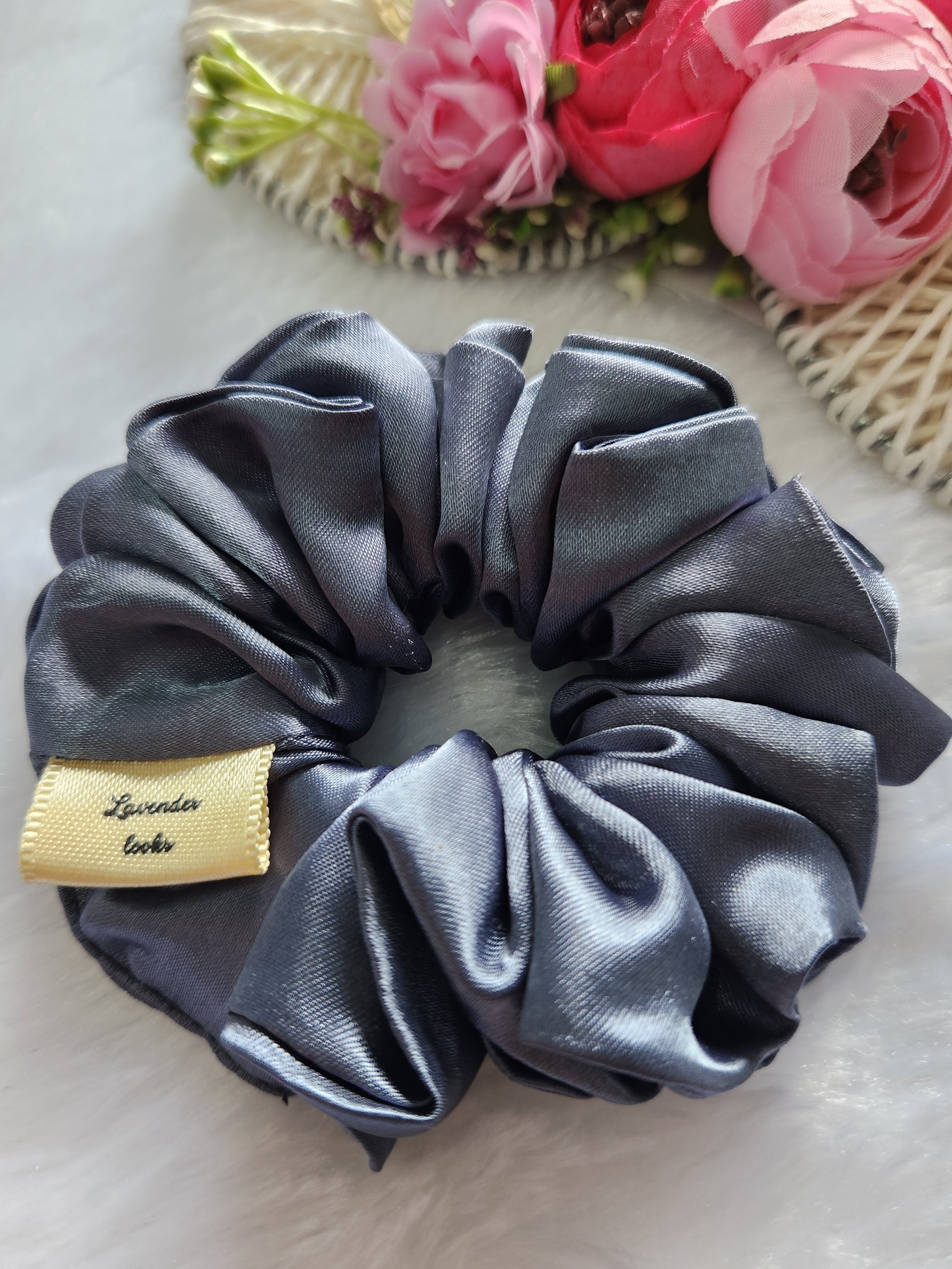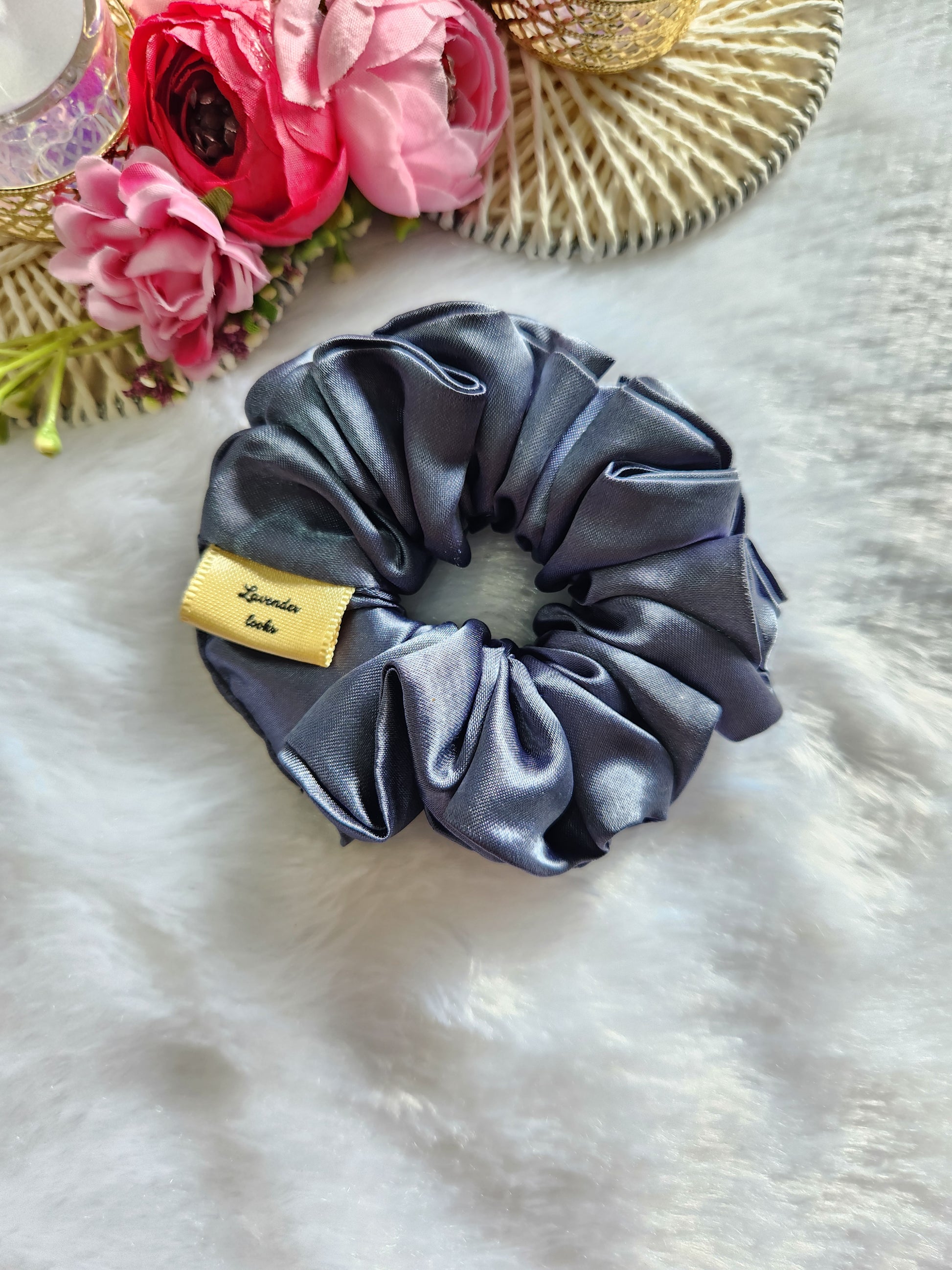 Elevate your hair routine with this luxurious satin scrunchie, designed to be both a stylish accessory and a gentle hair tie. The deep navy blue fabric has a beautiful, subtle sheen that catches the light, adding a touch of elegance to any hairstyle. It’s crafted from smooth, high-quality material that feels incredibly soft, helping to prevent tugging and hair breakage.